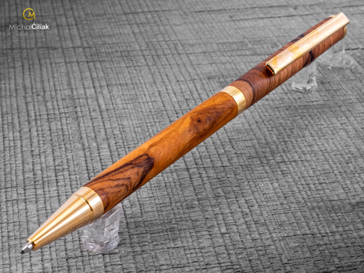 Handgefertigt aus farbigem Harz und erstklassigem Olivenholz, das fest, sehr widerstandsfähig und interessant gefärbt ist und von cremegelb über rosa bis schwarz reicht. Ich brachte es persönlich von der griechischen Insel Karpathos mit, nachdem ich fast sechs Wochen damit verbracht hatte, es zu finden. Der schwierigste Teil, der auch am längsten dauerte, war, mit einem örtlichen Bauern in Kontakt zu treten, der mir große Stücke Olivenholz verkaufte, dessen Alter er auf ungefähr 700 Jahre schätzte. Das langsame Wachstum des Baumes erzeugt ein sehr hartes Holz und eine große Vielfalt an Stammformen, die dem Olivenholz eine erstaunliche Gravur verleihen. EMPFEHLUNG: Ein Stift mit einer Geschichte, wie hunderte Jahre altes Olivenholz in den Hügeln der Insel Karpathos gefunden wurde, wie ich ausgewählte Stücke daraus zusammen mit einem lokalen Zimmermann herausgeschnitten habe, in meine Werkstatt brachte und ihnen neues Leben eingehaucht habe. Sehen Sie hier, wie dieser exquisite Stift in die Welt kam. Werden Sie Ihre eigenen Geschichten damit schreiben oder geben Sie es jemandem als ein wirklich einzigartiges Geschenk?