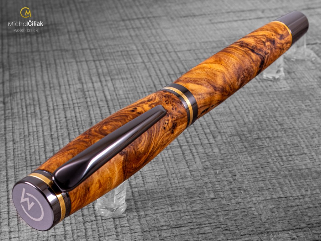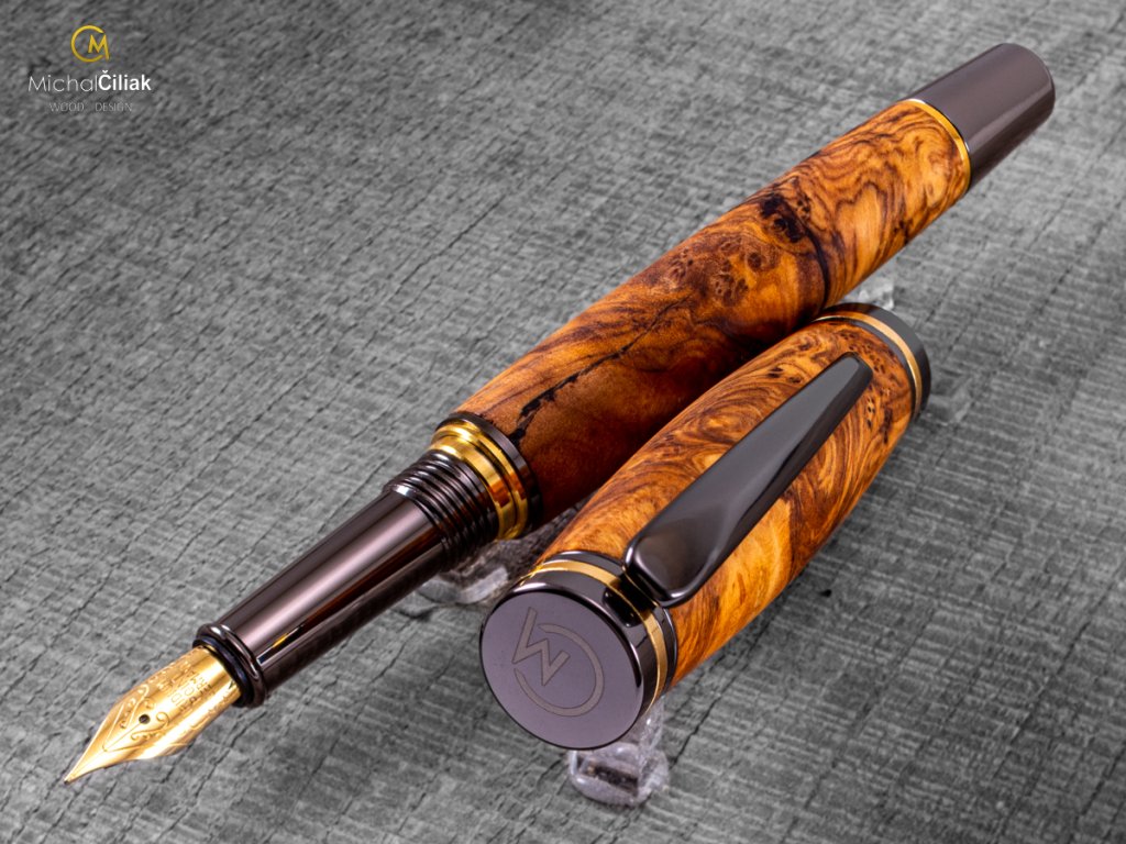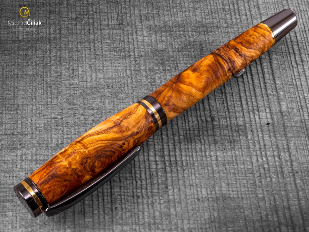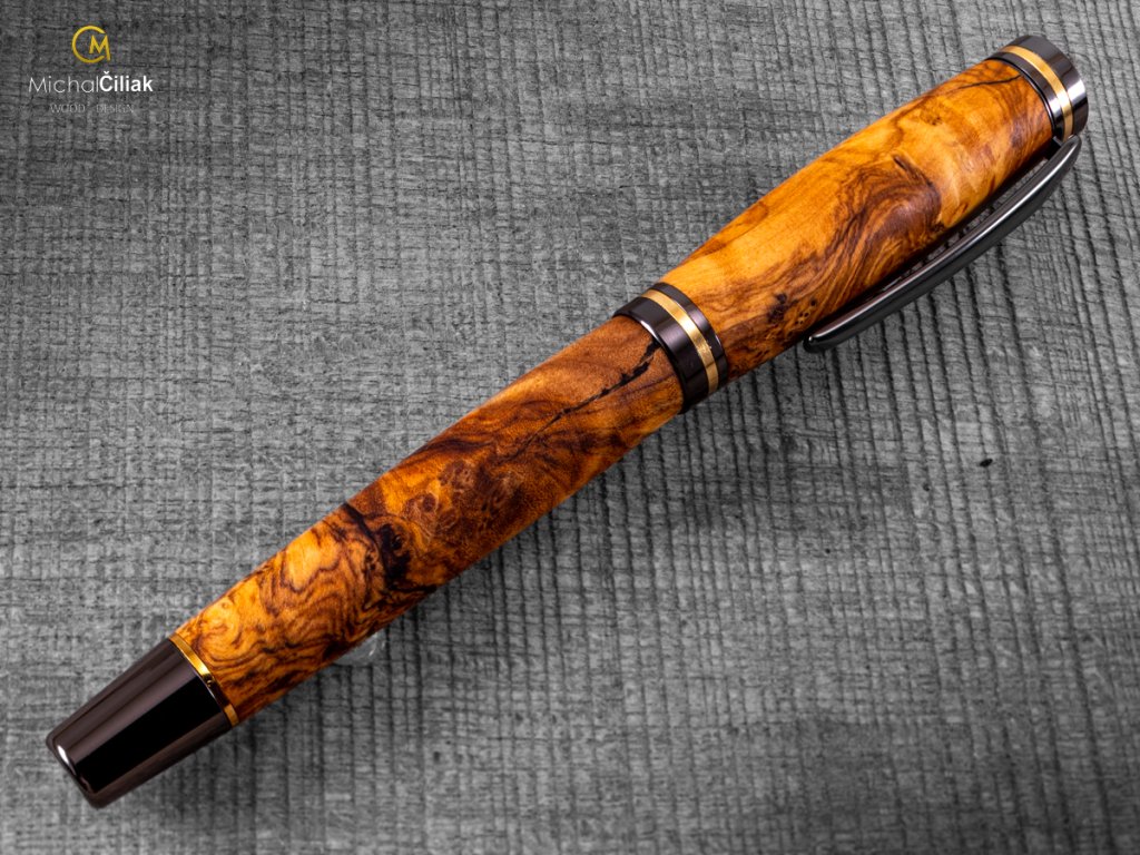 Handgefertigt aus farbigem Harz und erstklassigem Olivenholz, das fest, sehr widerstandsfähig und interessant gefärbt ist und von cremegelb über rosa bis schwarz reicht. Ich brachte es persönlich von der griechischen Insel Karpathos mit, nachdem ich fast sechs Wochen damit verbracht hatte, es zu finden. Der schwierigste Teil, der auch am längsten dauerte, war, mit einem örtlichen Bauern in Kontakt zu treten, der mir große Stücke Olivenholz verkaufte, dessen Alter er auf ungefähr 700 Jahre schätzte. Das langsame Wachstum des Baumes erzeugt ein sehr hartes Holz und eine große Vielfalt an Stammformen, die dem Olivenholz eine erstaunliche Gravur verleihen. EMPFEHLUNG: Ein Stift mit einer Geschichte, wie hunderte Jahre altes Olivenholz in den Hügeln der Insel Karpathos gefunden wurde, wie ich ausgewählte Stücke daraus zusammen mit einem lokalen Zimmermann herausgeschnitten habe, in meine Werkstatt brachte und ihnen neues Leben eingehaucht habe. Sehen Sie hier, wie dieser exquisite Stift in die Welt kam. Werden Sie Ihre eigenen Geschichten damit schreiben oder geben Sie es jemandem als ein wirklich einzigartiges Geschenk?