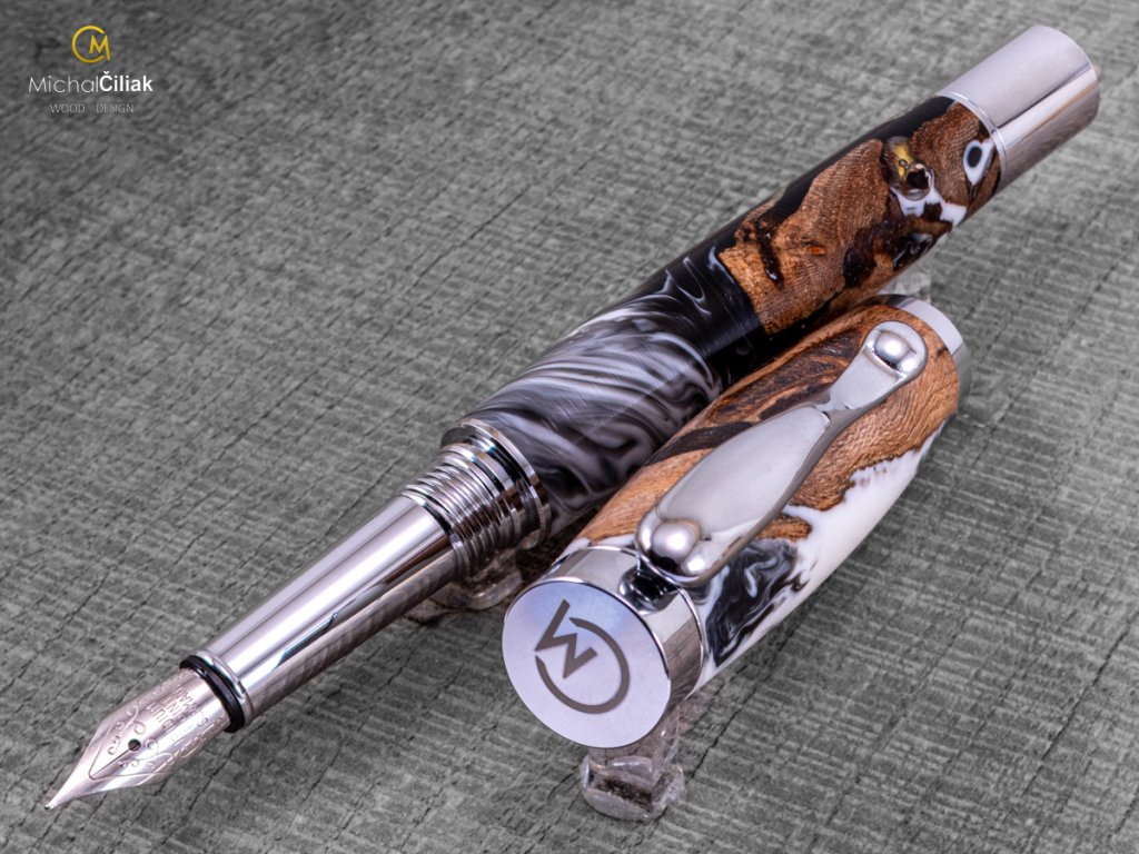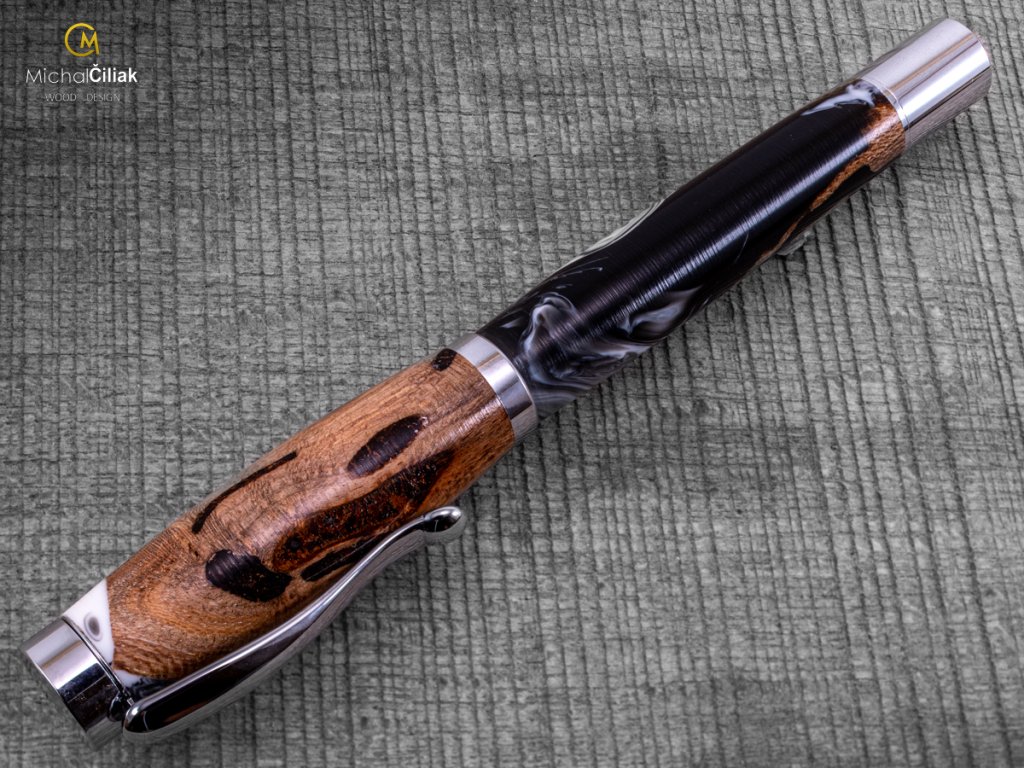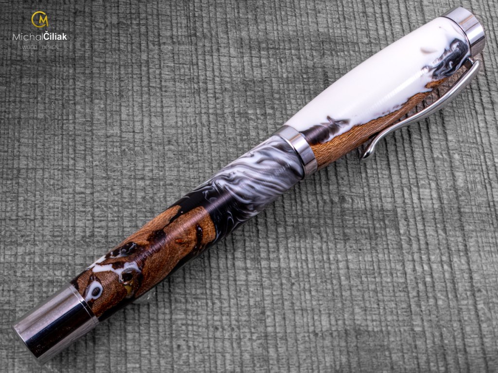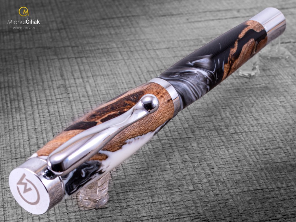 Handgefertigt aus Weinrebenholz und farbigem Harz. Der Herstellungsprozess ist ziemlich kompliziert, der Bedarf an getrockneten Weinreben Holzstämmen, die dann mit einer speziellen, reinen Harz-gefärbten Perlenfarbe begossen werden. Nach dem Gießen müssen Luftblasen aus dem Harz entfernt werden. Der Prozess beginnt, wenn das Holzharz in den Drucktopf gegeben wird und die Blasen mit einem Druck von 6 bar langsam an die Oberfläche gedrückt werden. Nachdem das Harz hart und trocken ist, wird der gesamte Block in kleinen Prismen formatiert, aus denen ich dann diesen schönen und interessanten Stift drehe.