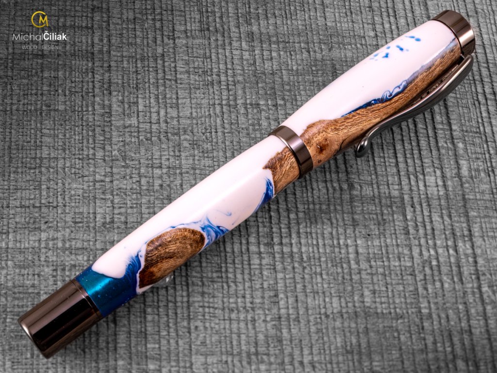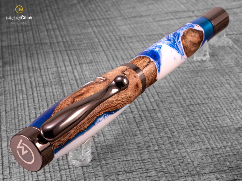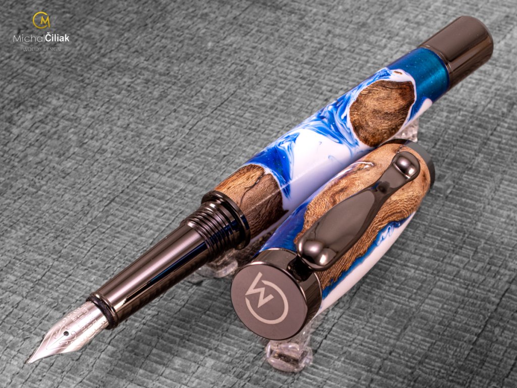 Handgefertigt aus Weinrebenholz und farbigem Harz. Der Herstellungsprozess ist ziemlich kompliziert, der Bedarf an getrockneten Weinreben Holzstämmen, die dann mit einer speziellen, reinen Harz-gefärbten Perlenfarbe begossen werden. Nach dem Gießen müssen Luftblasen aus dem Harz entfernt werden. Der Prozess beginnt, wenn das Holzharz in den Drucktopf gegeben wird und die Blasen mit einem Druck von 6 bar langsam an die Oberfläche gedrückt werden. Nachdem das Harz hart und trocken ist, wird der gesamte Block in kleinen Prismen formatiert, aus denen ich dann diesen schönen und interessanten Stift drehe.
