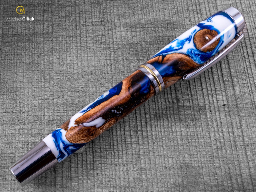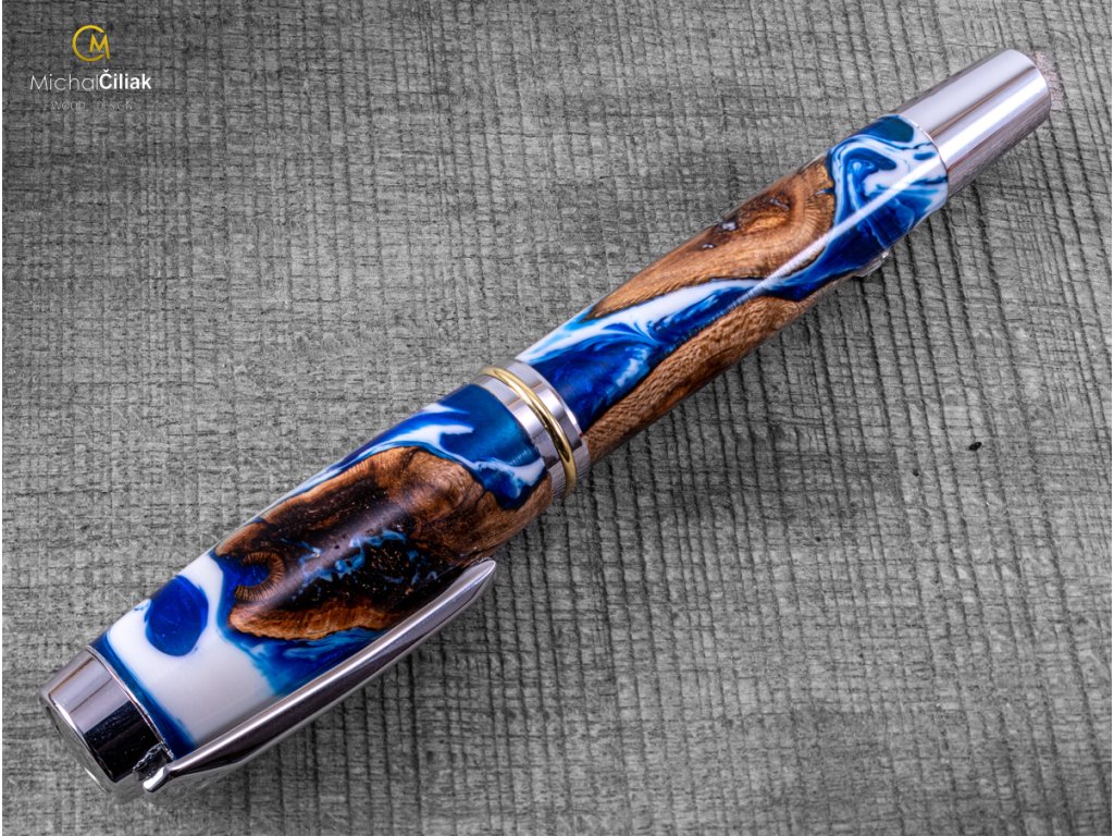 Handgefertigt aus Weinrebenholz und farbigem Harz. Der Herstellungsprozess ist ziemlich kompliziert, der Bedarf an getrockneten Weinreben Holzstämmen, die dann mit einer speziellen, reinen Harz-gefärbten Perlenfarbe begossen werden. Nach dem Gießen müssen Luftblasen aus dem Harz entfernt werden. Der Prozess beginnt, wenn das Holzharz in den Drucktopf gegeben wird und die Blasen mit einem Druck von 6 bar langsam an die Oberfläche gedrückt werden. Nachdem das Harz hart und trocken ist, wird der gesamte Block in kleinen Prismen formatiert, aus denen ich dann diesen schönen und interessanten Stift drehe.