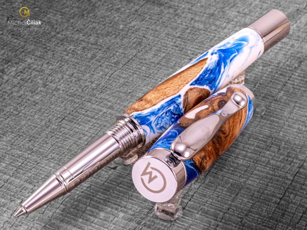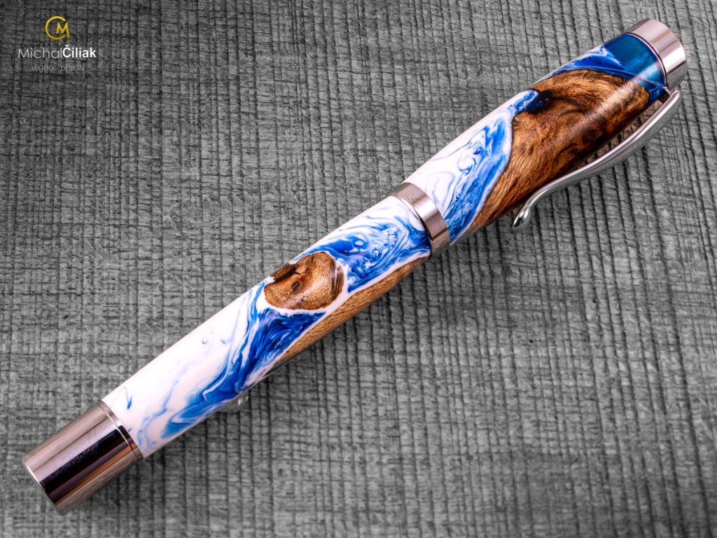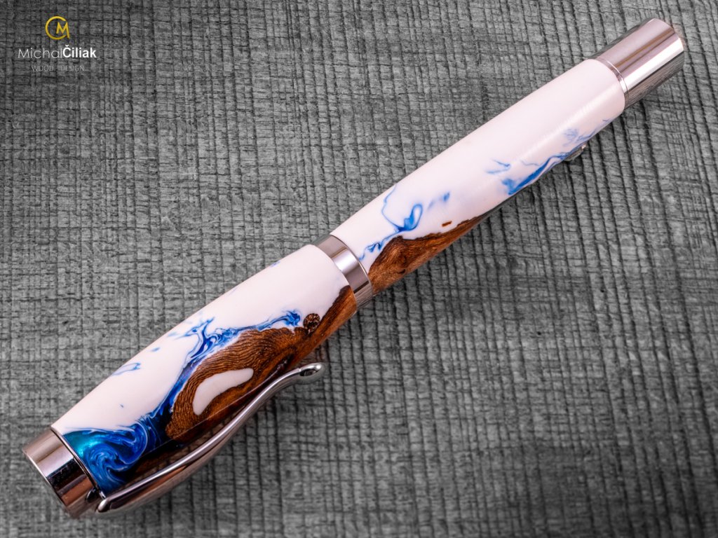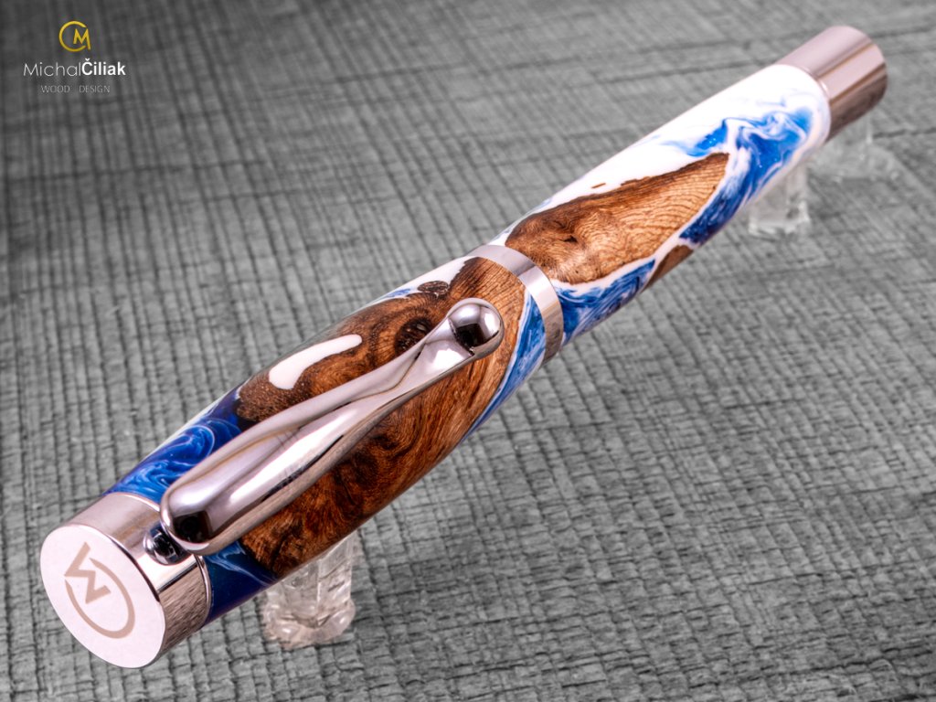 Handgefertigt aus Weinrebenholz und farbigem Harz. Der Herstellungsprozess ist ziemlich kompliziert, der Bedarf an getrockneten Weinreben Holzstämmen, die dann mit einer speziellen, reinen Harz-gefärbten Perlenfarbe begossen werden. Nach dem Gießen müssen Luftblasen aus dem Harz entfernt werden. Der Prozess beginnt, wenn das Holzharz in den Drucktopf gegeben wird und die Blasen mit einem Druck von 6 bar langsam an die Oberfläche gedrückt werden. Nachdem das Harz hart und trocken ist, wird der gesamte Block in kleinen Prismen formatiert, aus denen ich dann diesen schönen und interessanten Stift drehe.