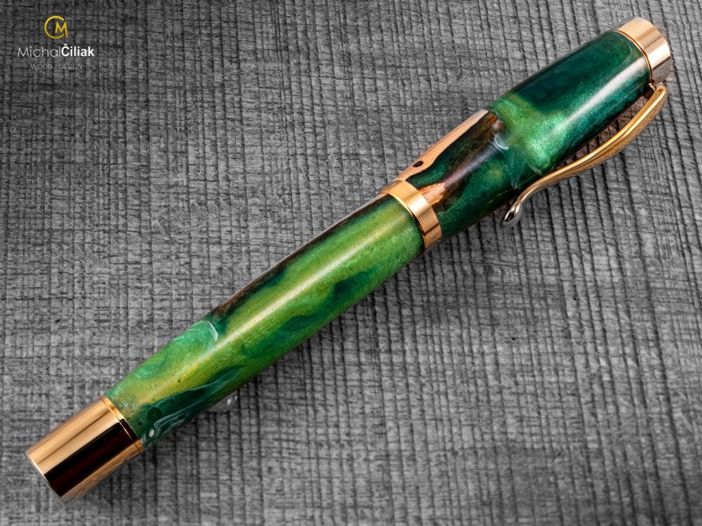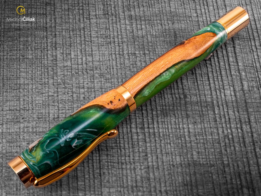 Handgefertigt aus Weinrebenholz und farbigem Harz. Der Herstellungsprozess ist ziemlich kompliziert, der Bedarf an getrockneten Weinreben Holzstämmen, die dann mit einer speziellen, reinen Harz-gefärbten Perlenfarbe begossen werden. Nach dem Gießen müssen Luftblasen aus dem Harz entfernt werden. Der Prozess beginnt, wenn das Holzharz in den Drucktopf gegeben wird und die Blasen mit einem Druck von 6 bar langsam an die Oberfläche gedrückt werden. Nachdem das Harz hart und trocken ist, wird der gesamte Block in kleinen Prismen formatiert, aus denen ich dann diesen schönen und interessanten Stift drehe.