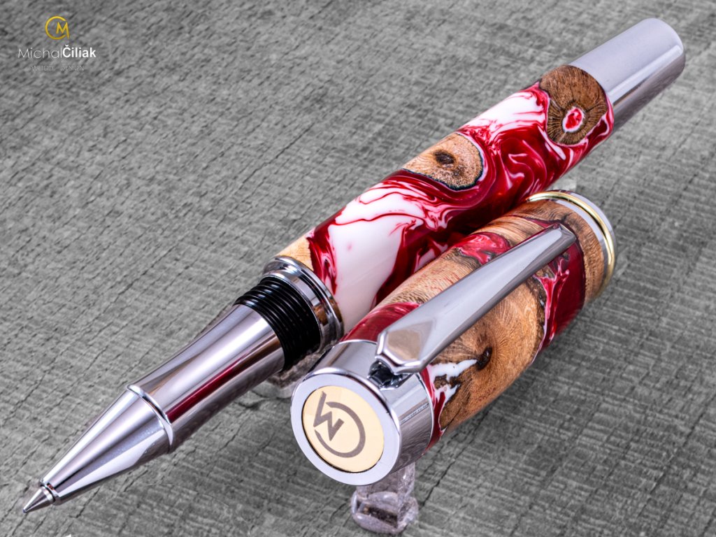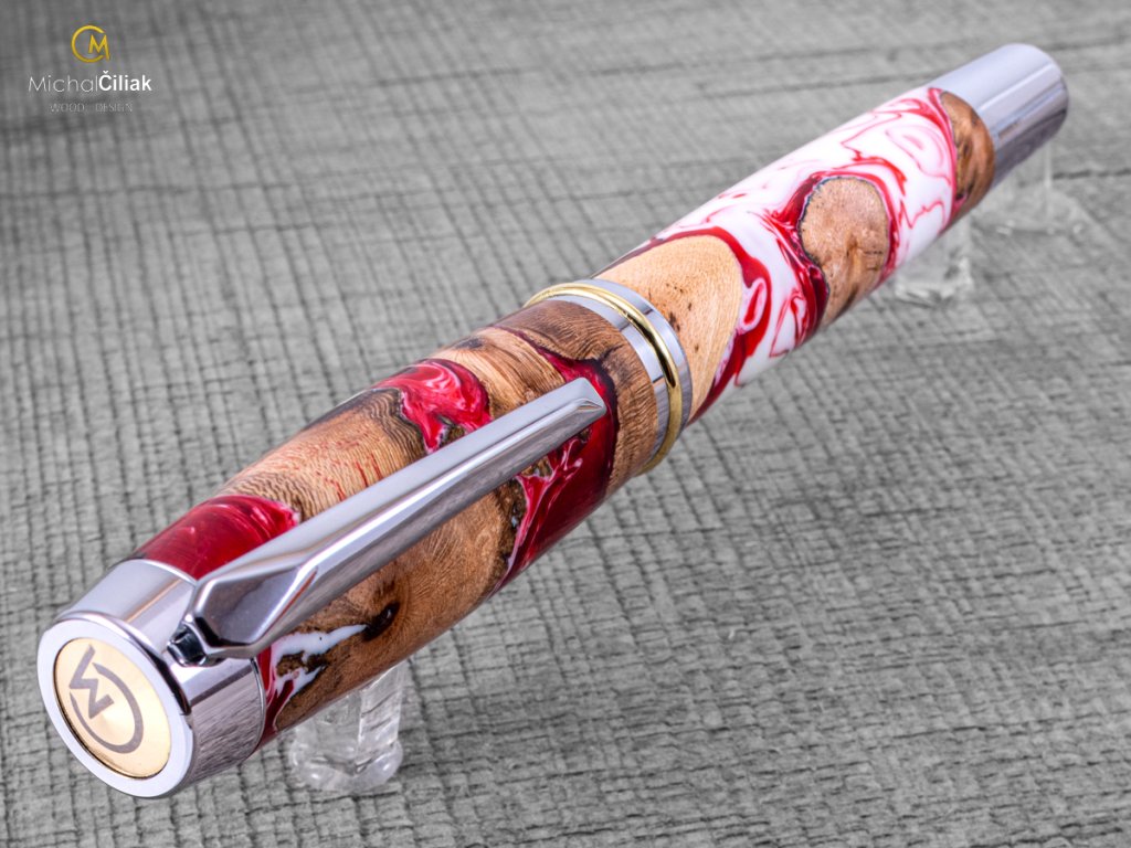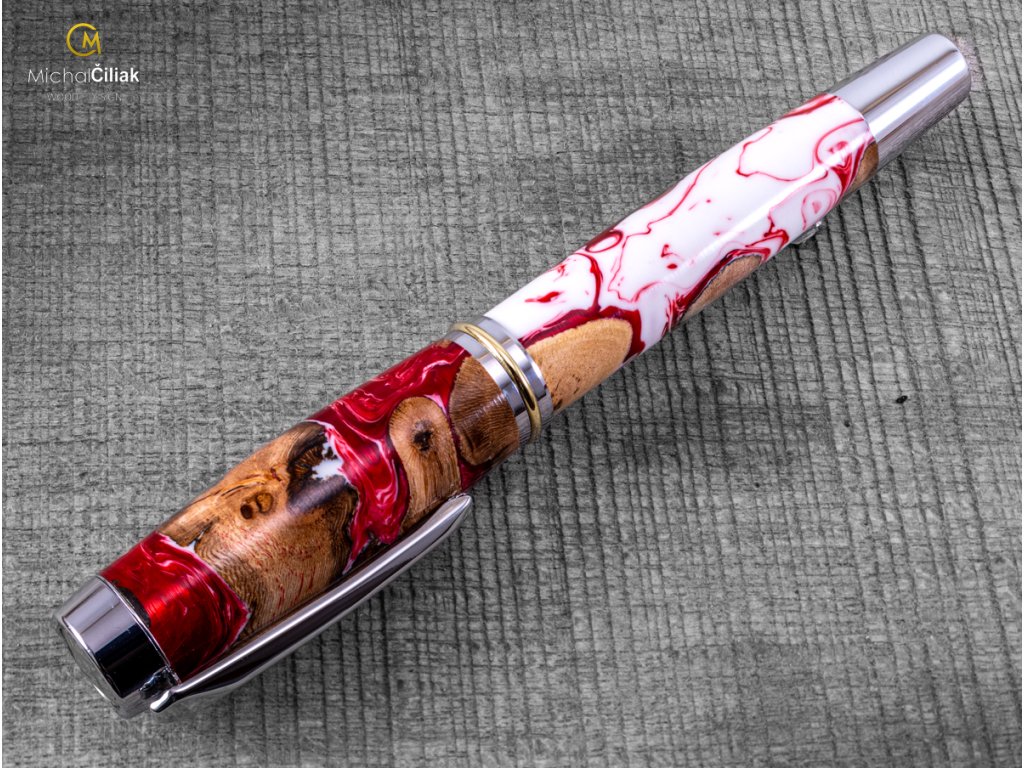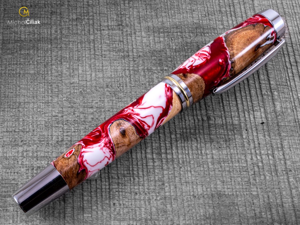 Handgefertigt aus Weinrebenholz und farbigem Harz. Der Herstellungsprozess ist ziemlich kompliziert, der Bedarf an getrockneten Weinreben Holzstämmen, die dann mit einer speziellen, reinen Harz-gefärbten Perlenfarbe begossen werden. Nach dem Gießen müssen Luftblasen aus dem Harz entfernt werden. Der Prozess beginnt, wenn das Holzharz in den Drucktopf gegeben wird und die Blasen mit einem Druck von 6 bar langsam an die Oberfläche gedrückt werden. Nachdem das Harz hart und trocken ist, wird der gesamte Block in kleinen Prismen formatiert, aus denen ich dann diesen schönen und interessanten Stift drehe.