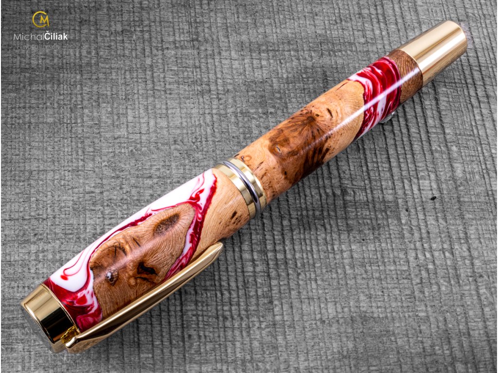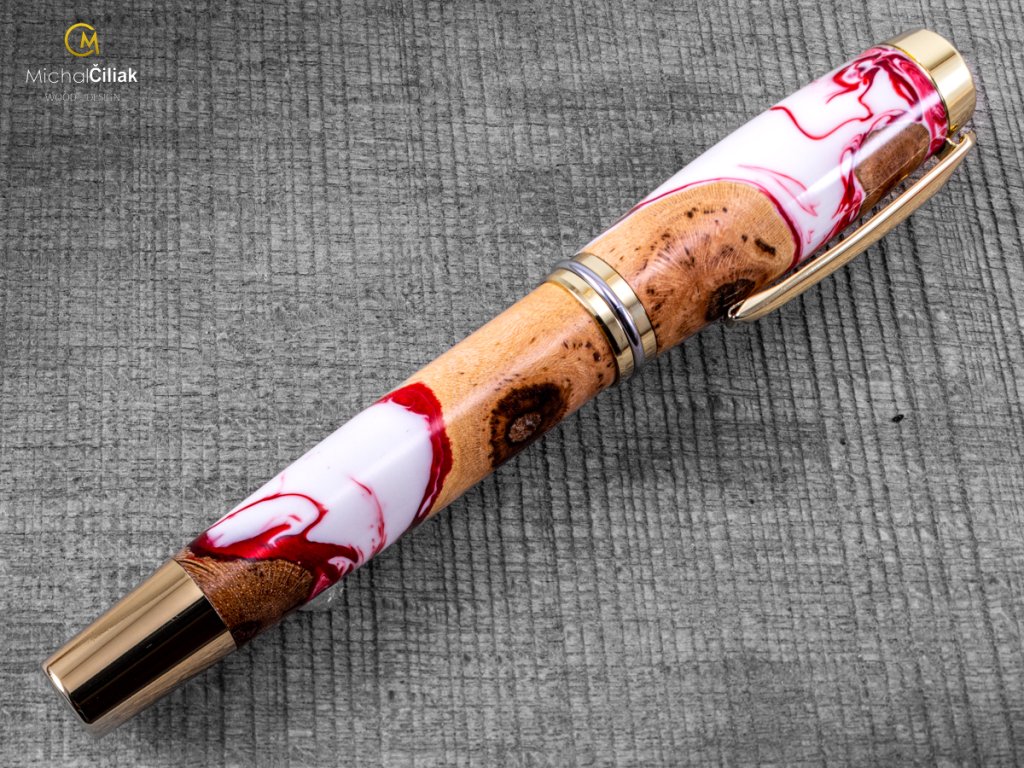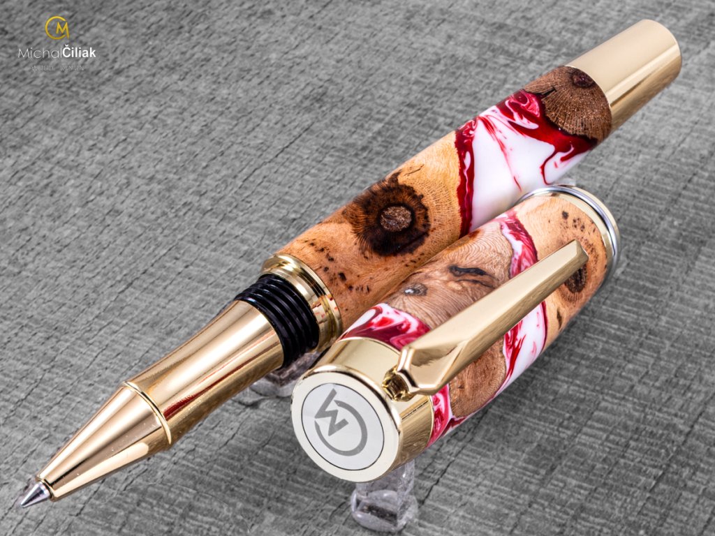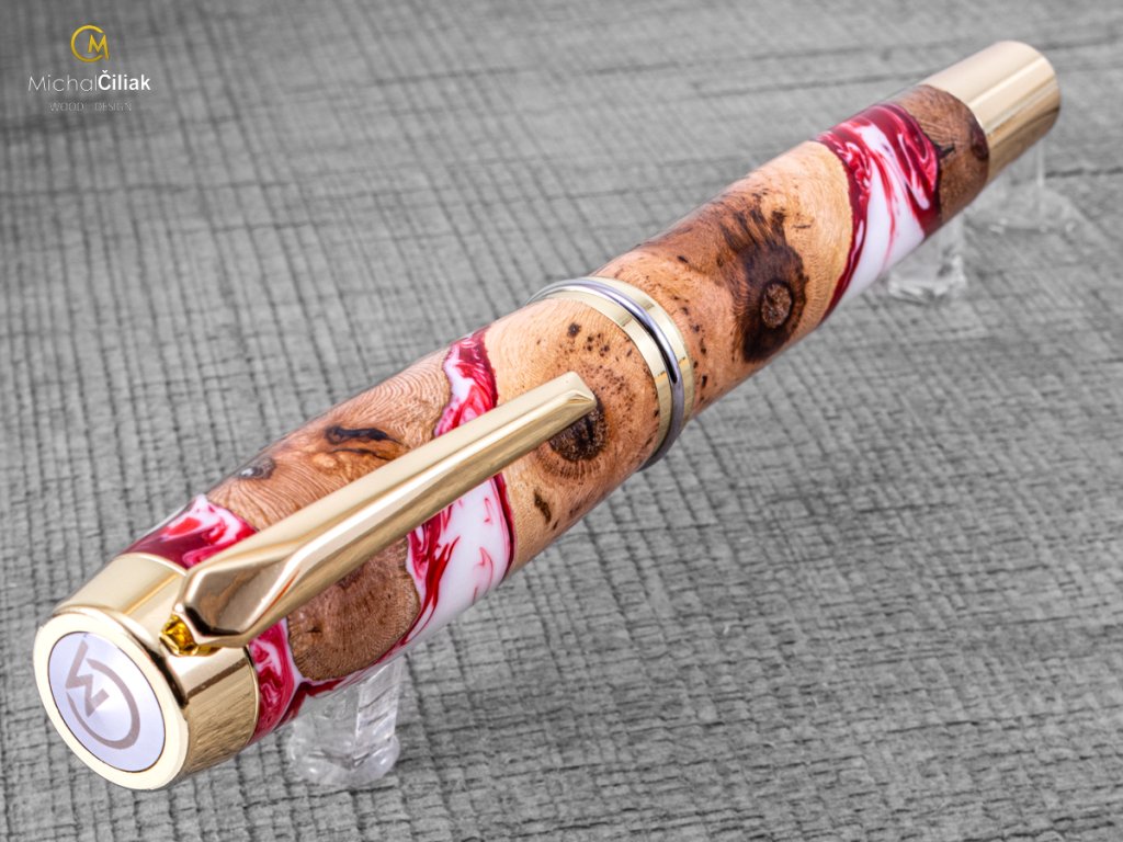Handgefertigt aus Weinrebenholz und farbigem Harz. Der Herstellungsprozess ist ziemlich kompliziert, der Bedarf an getrockneten Weinreben Holzstämmen, die dann mit einer speziellen, reinen Harz-gefärbten Perlenfarbe begossen werden. Nach dem Gießen müssen Luftblasen aus dem Harz entfernt werden. Der Prozess beginnt, wenn das Holzharz in den Drucktopf gegeben wird und die Blasen mit einem Druck von 6 bar langsam an die Oberfläche gedrückt werden. Nachdem das Harz hart und trocken ist, wird der gesamte Block in kleinen Prismen formatiert, aus denen ich dann diesen schönen und interessanten Stift drehe.