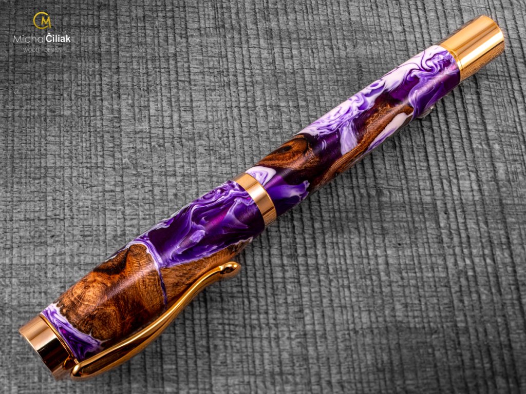Handgefertigt aus Weinrebenholz und farbigem Harz. Der Herstellungsprozess ist ziemlich kompliziert, der Bedarf an getrockneten Weinreben Holzstämmen, die dann mit einer speziellen, reinen Harz-gefärbten Perlenfarbe begossen werden. Nach dem Gießen müssen Luftblasen aus dem Harz entfernt werden. Der Prozess beginnt, wenn das Holzharz in den Drucktopf gegeben wird und die Blasen mit einem Druck von 6 bar langsam an die Oberfläche gedrückt werden. Nachdem das Harz hart und trocken ist, wird der gesamte Block in kleinen Prismen formatiert, aus denen ich dann diesen schönen und interessanten Stift drehe.