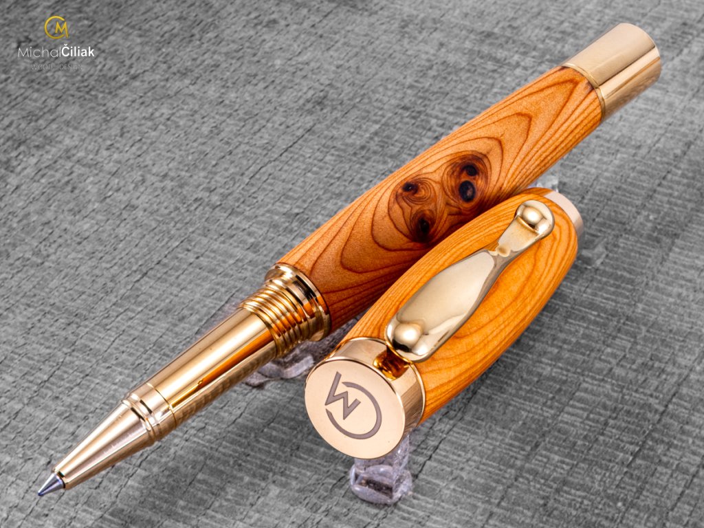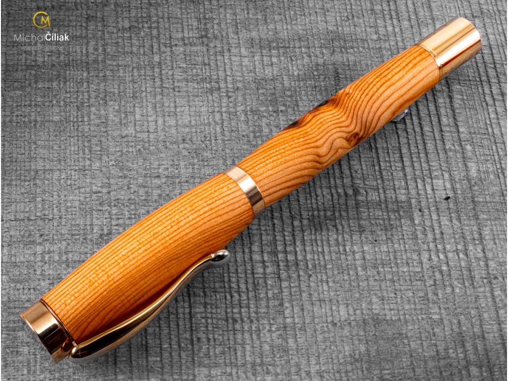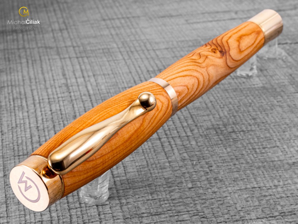 Handgemacht von der seltenen Eibe, einer der härtesten Nadelbäume in Europa. Seine rötlich-orange Farbe Holz hat ausgeprägte Jahresringe, die eine schöne Gravierung schaffen. Damit ein aus diesem Holz gefertigter Stift auch interessant aussieht, muss man das Material sehr sorgfältig suchen und auswählen. So entstand auch dieses exklusive Stück.
